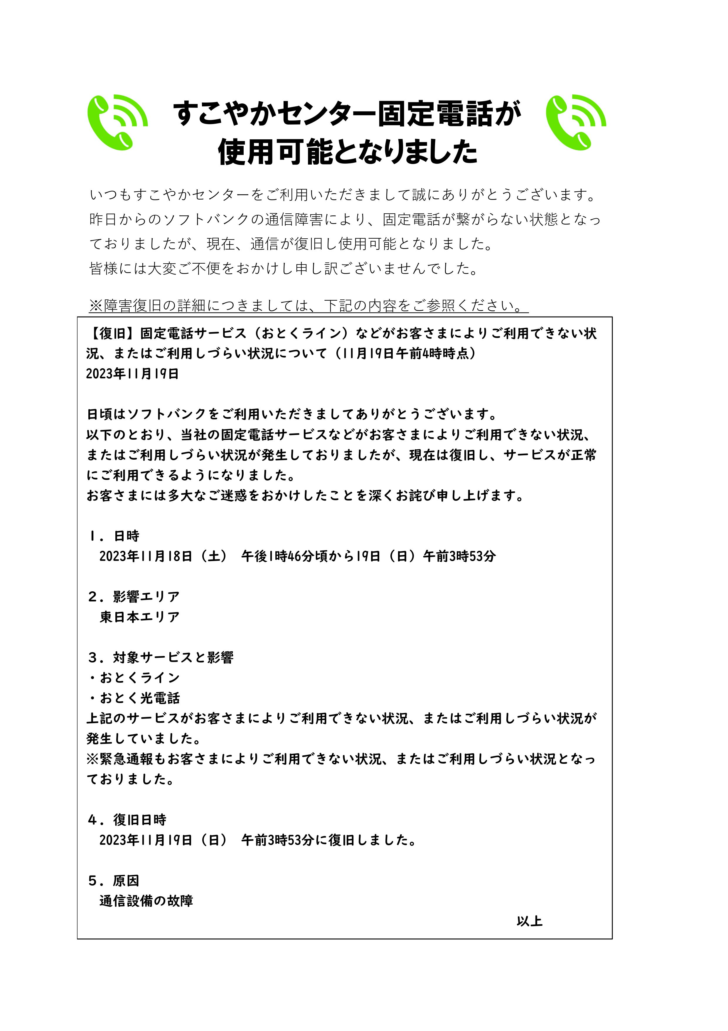昨日からのソフトバンク通信障害により、すこやかセンターの固定電話が繋がらない状態と