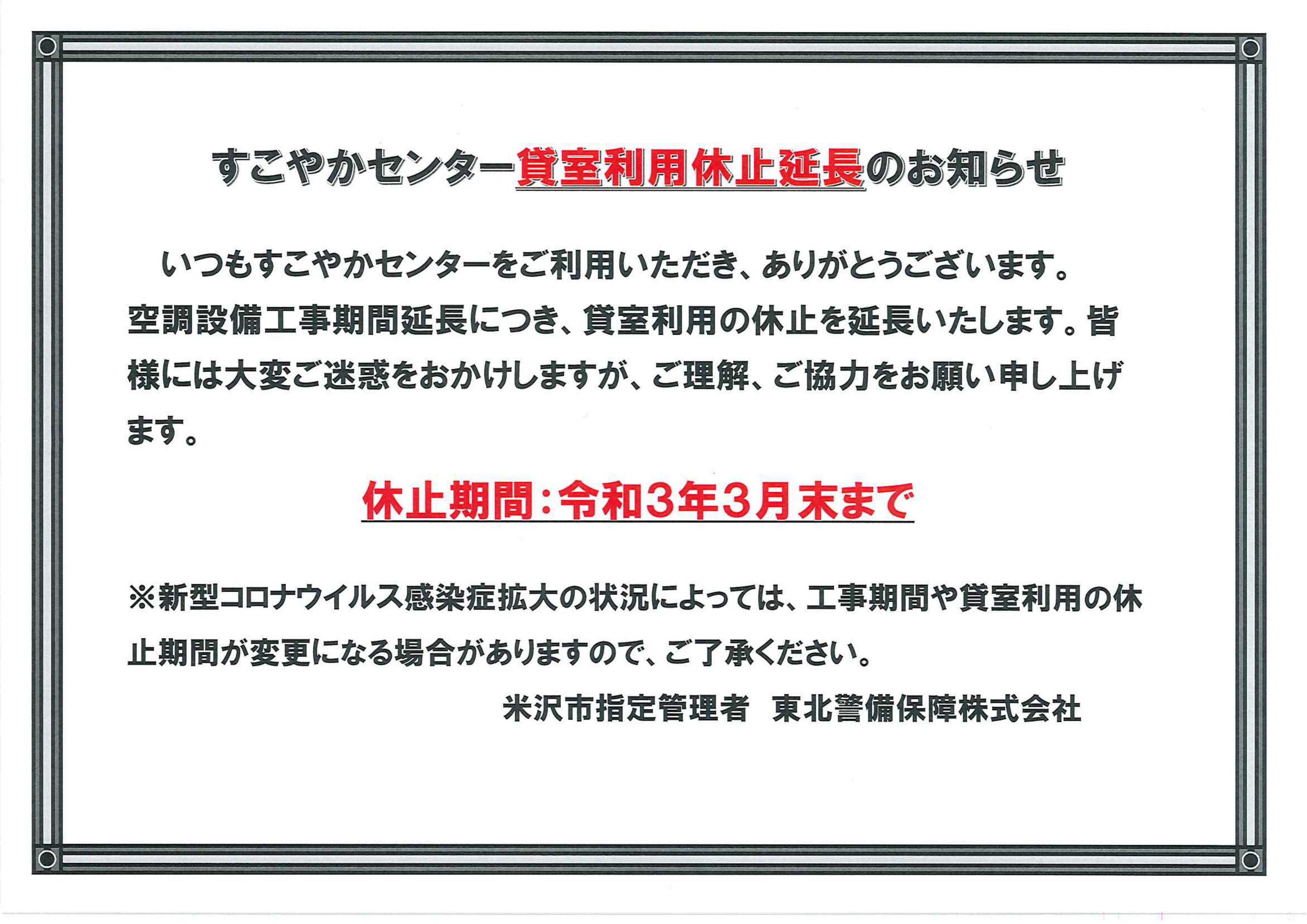 すこやかセンター貸室休止延長のお知らせ