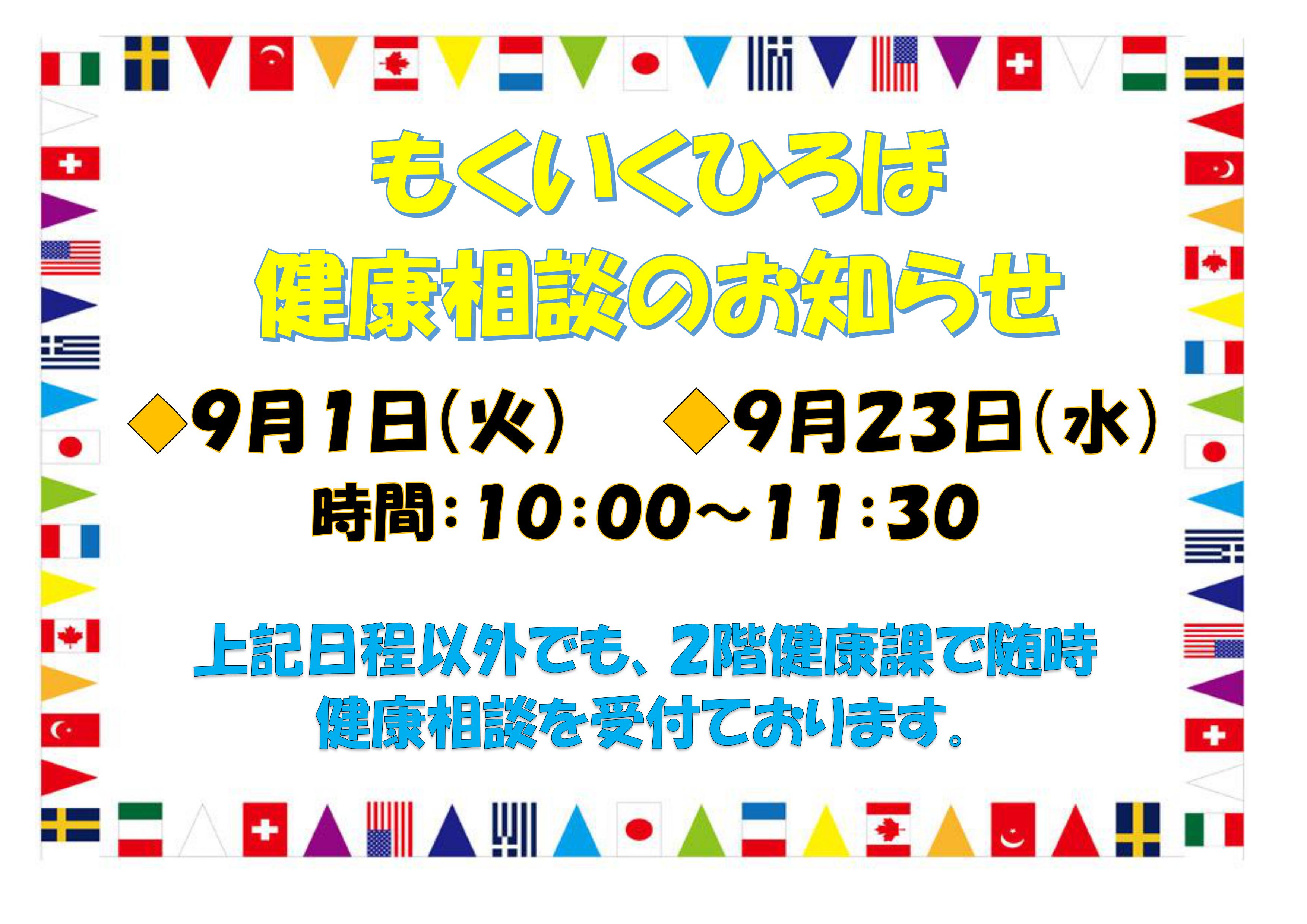9月のもくいくひろば健康相談のお知らせをいたします。