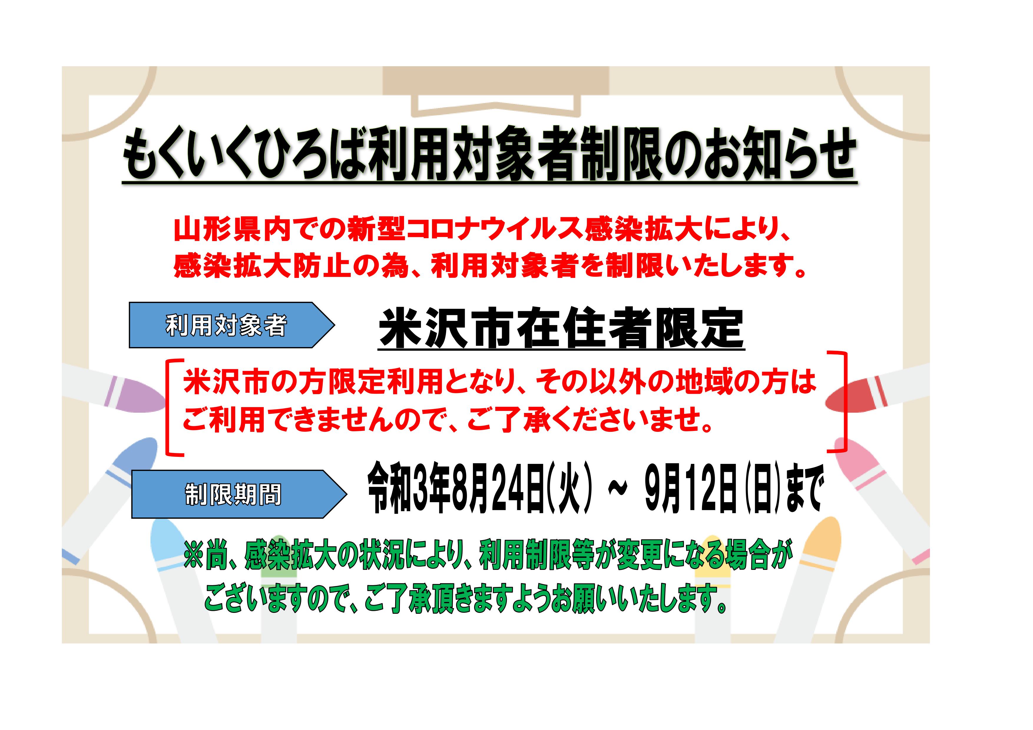 いつも、もくいくひろばをご利用頂きありがとうございます。 コロナウイルス感染症の拡大を受け、もくいくひろば利用制限を次の様に変更させて 頂く事になりました。 皆様のご理解とご協力をよろしくお願い申し上げます。