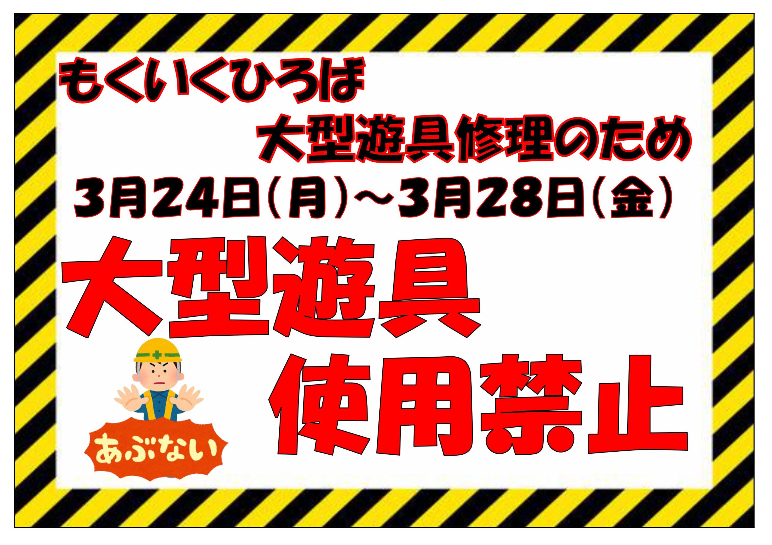 もくいくひろば大型遊具の修理のため、下記の期間大型遊具の使用を禁止します。