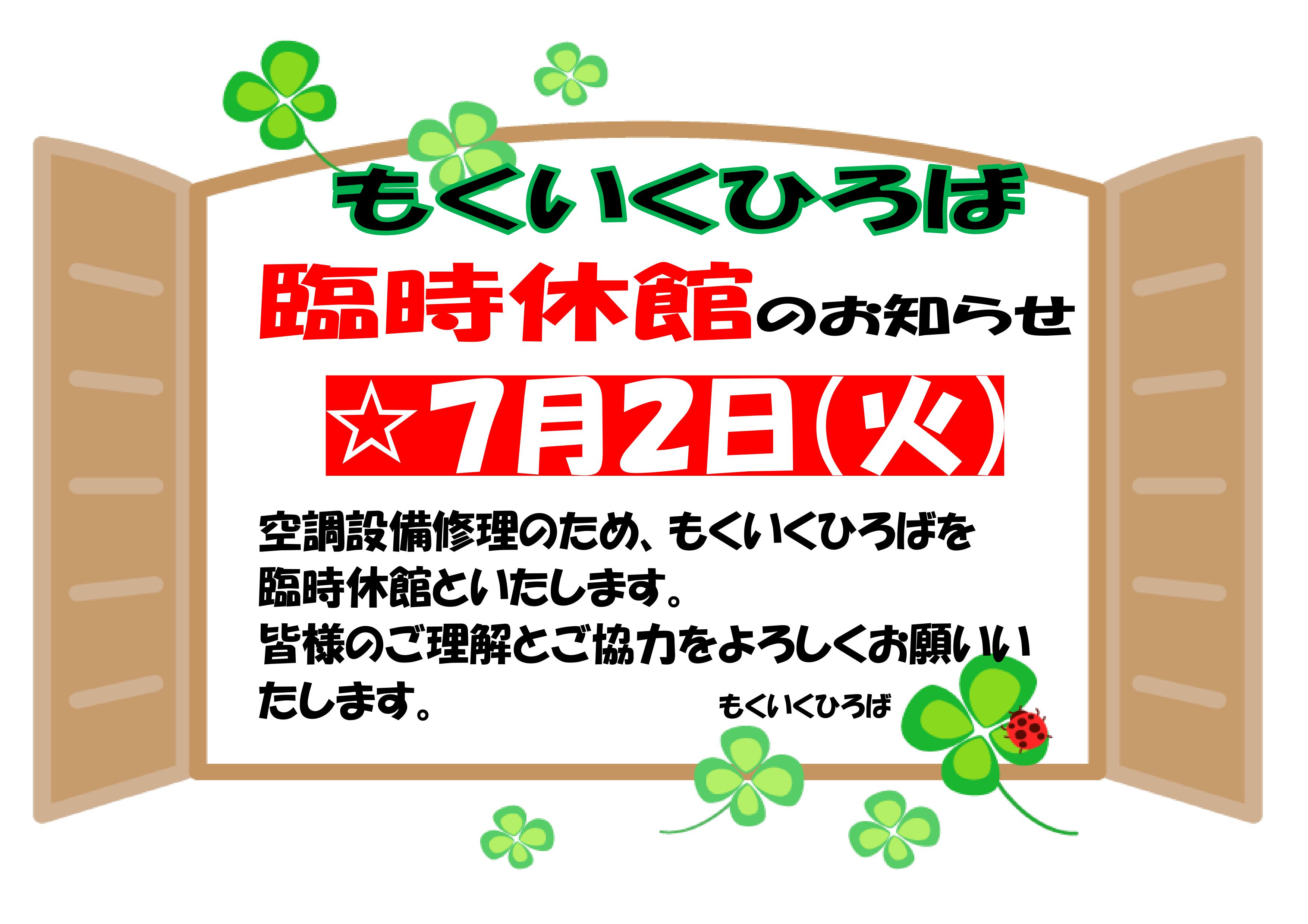 7月2日(火)空調設備修理のため、もくいくひろばを臨時休館といたします。