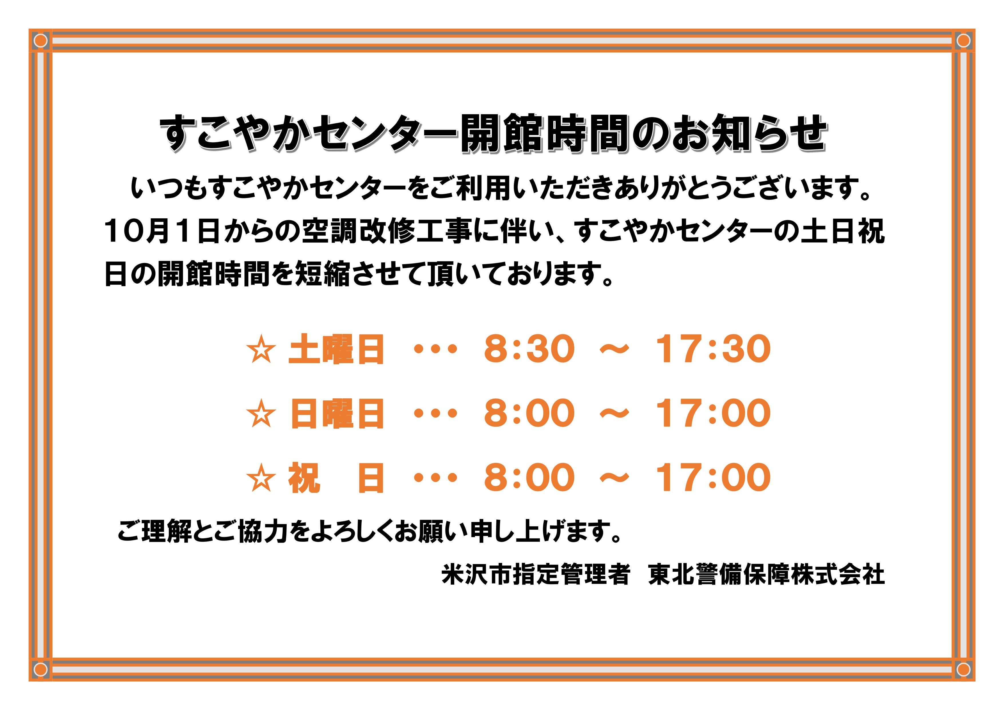 Copyright(c) 2014 米沢市すこやかセンター All Rights Reserved. 指定管理者 東北警備保障株式会社