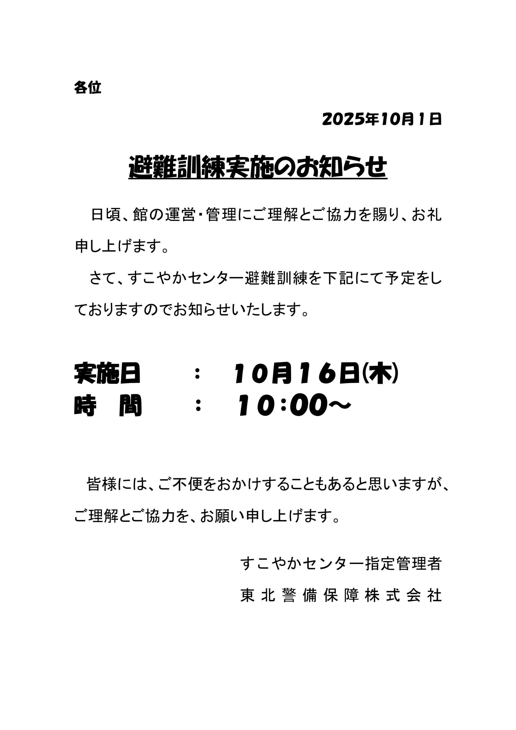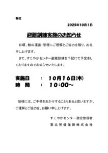 避難訓練日のお知らせ