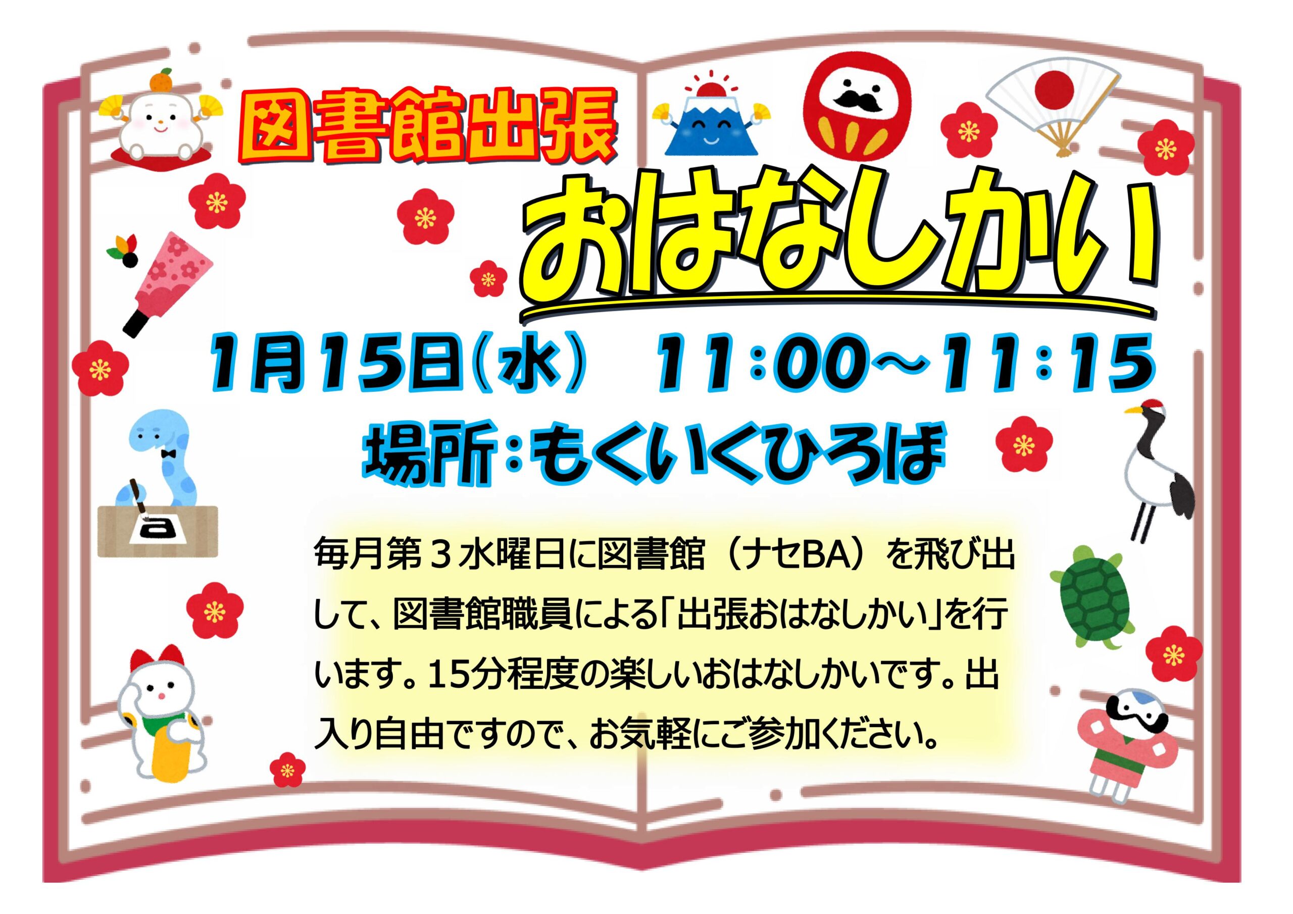 1月の図書館出張おはなしかいは15日(水)11:00~11:15となっております。