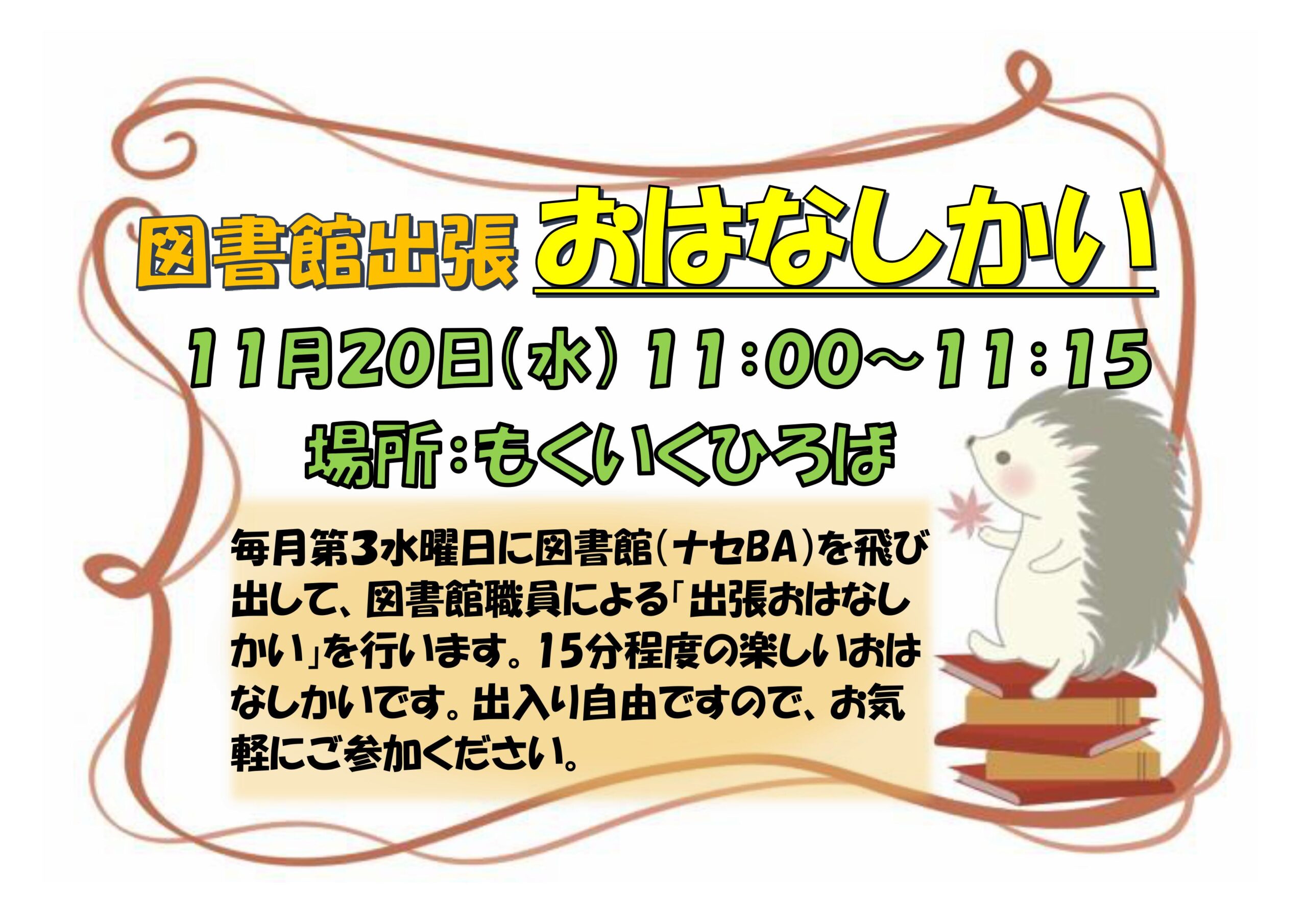 11月の図書館出張おはなしかいは20日(水)11:00~11:15となっております。