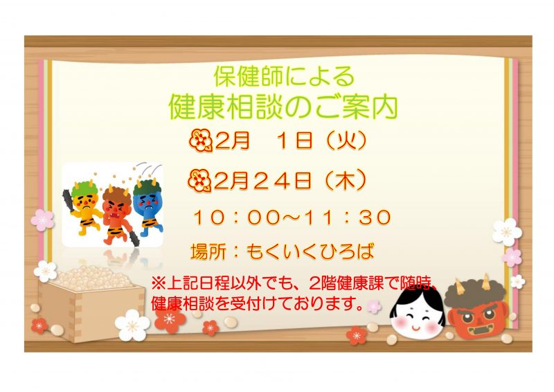 2月「もくいくひろば 健康・栄養相談」の日程をお知らせいたします。