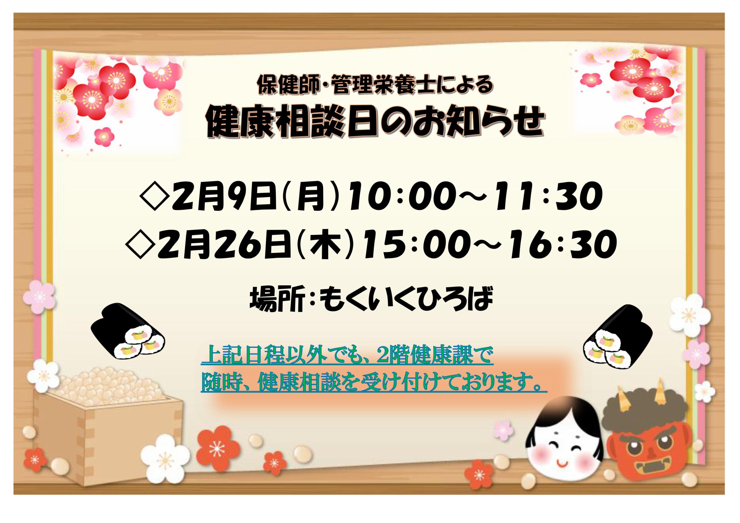 2月のもくいくひろば健康相談日は、次の2日間で行います。