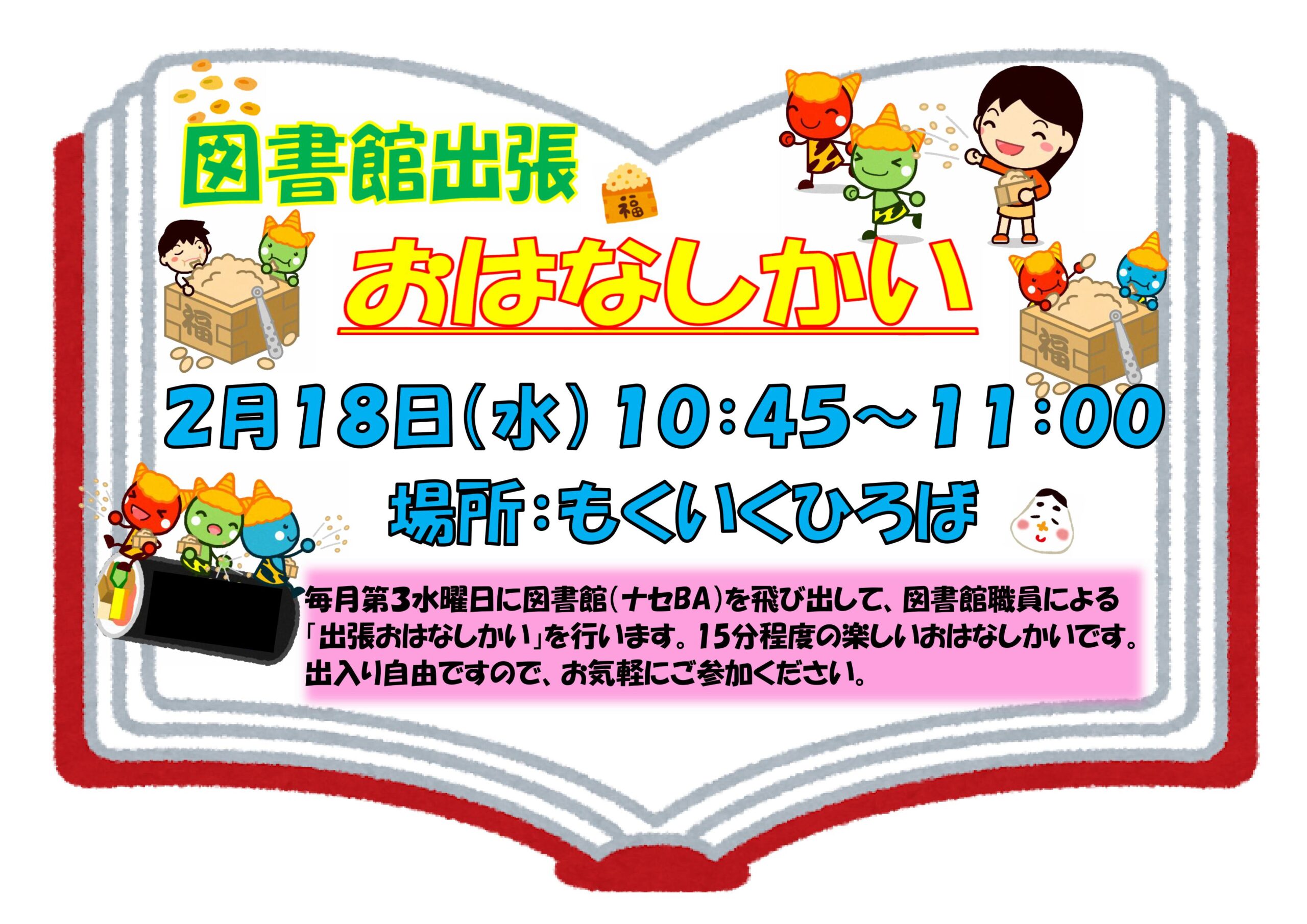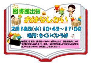 2月の『図書館出張おはなしかい』は18日(水)の10:45~11:00となっております。