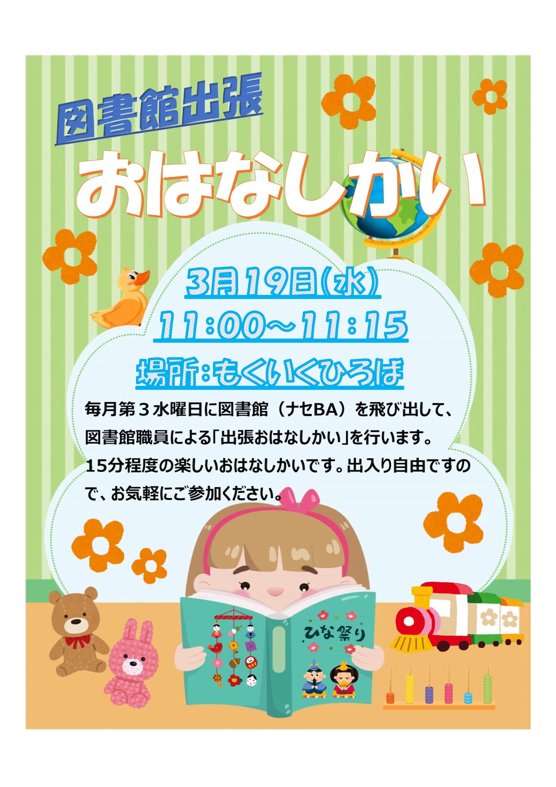 3月の図書館出張おはなしかいは19日(水)11:00~11:15となっております。