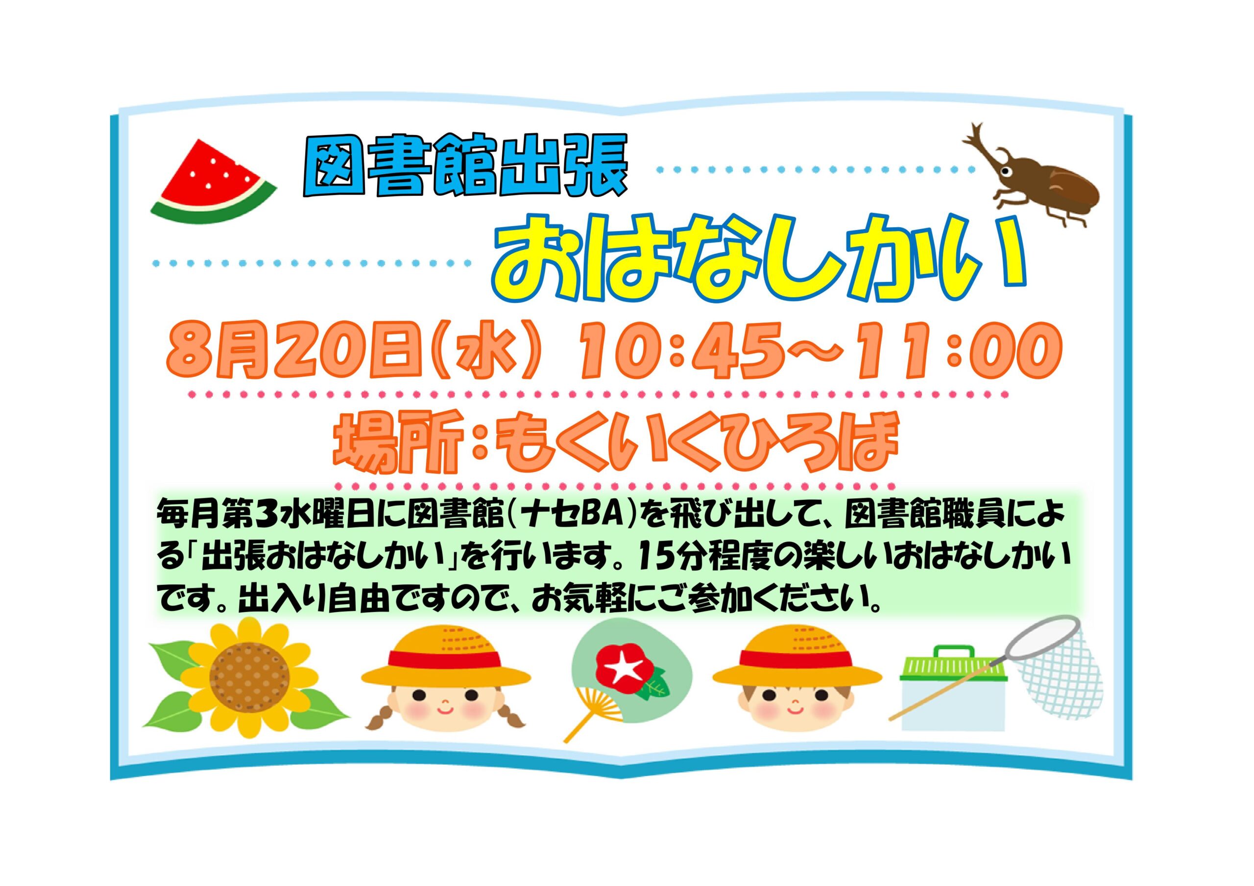 8月の図書館出張おはなしかいは20日(水)10:45~11:00となっております。