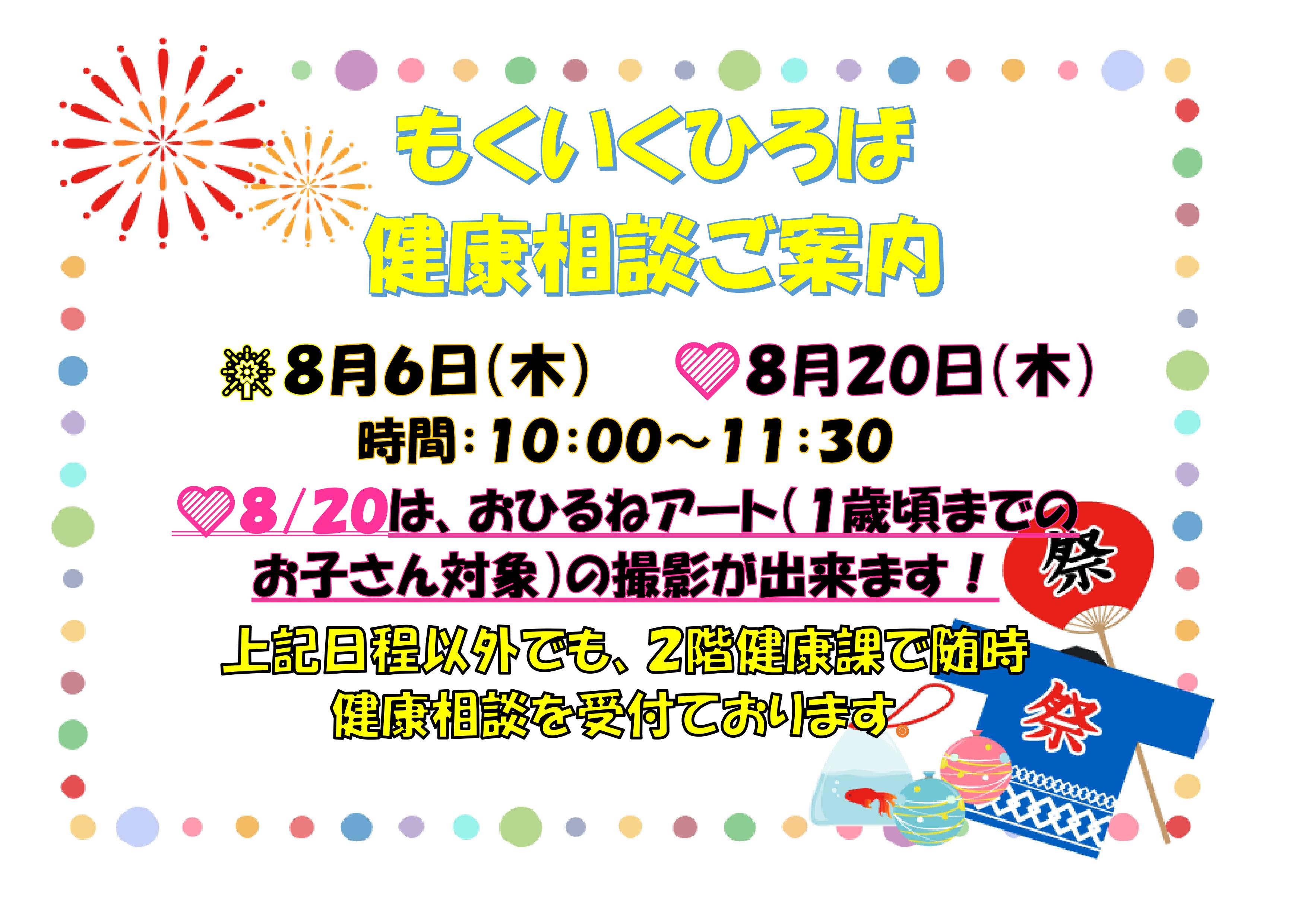 8月のもくいくひろばの健康相談日をお知らせいたしますので、