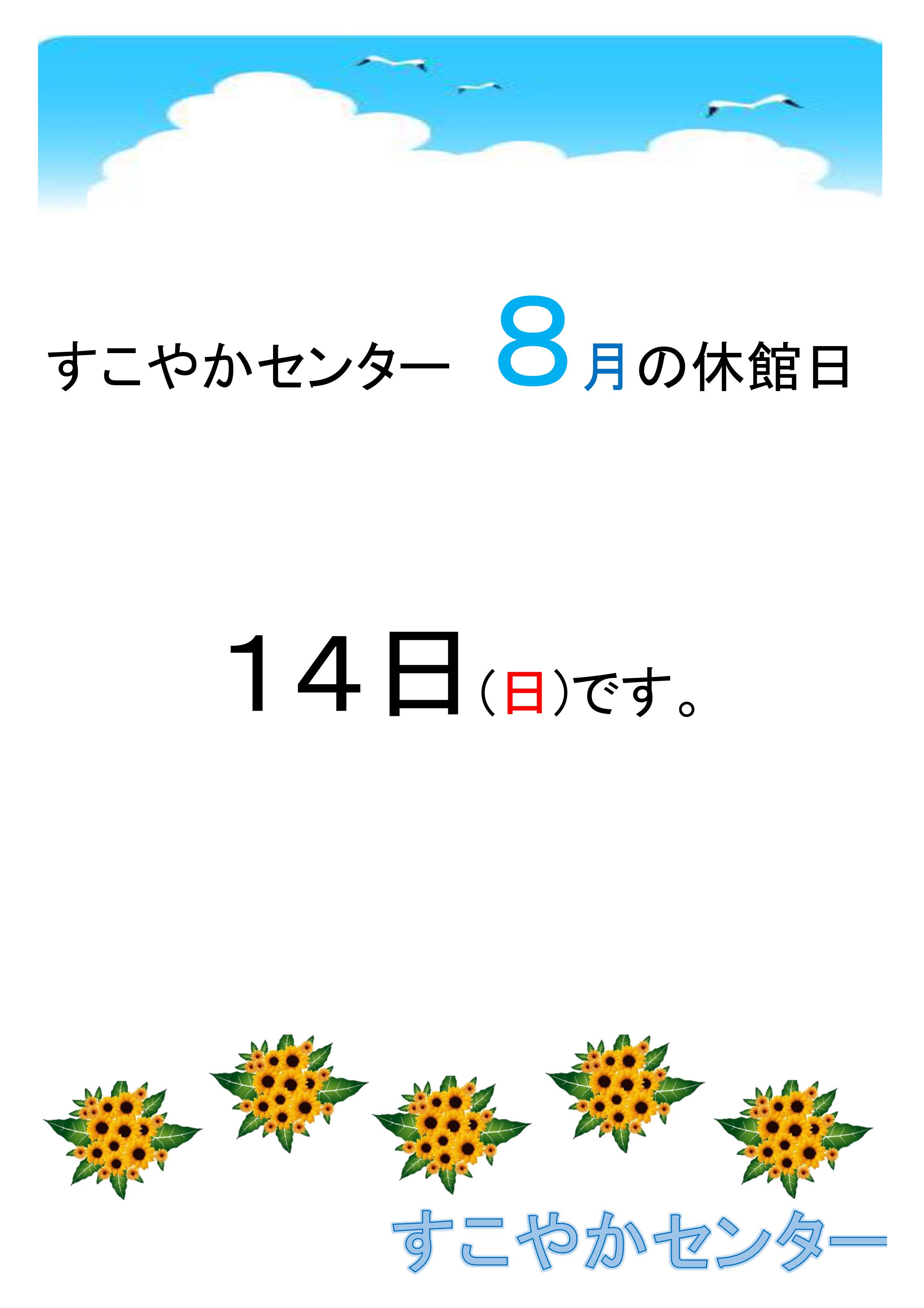 8月の休館日は、14日(日)第2日曜日となっております。