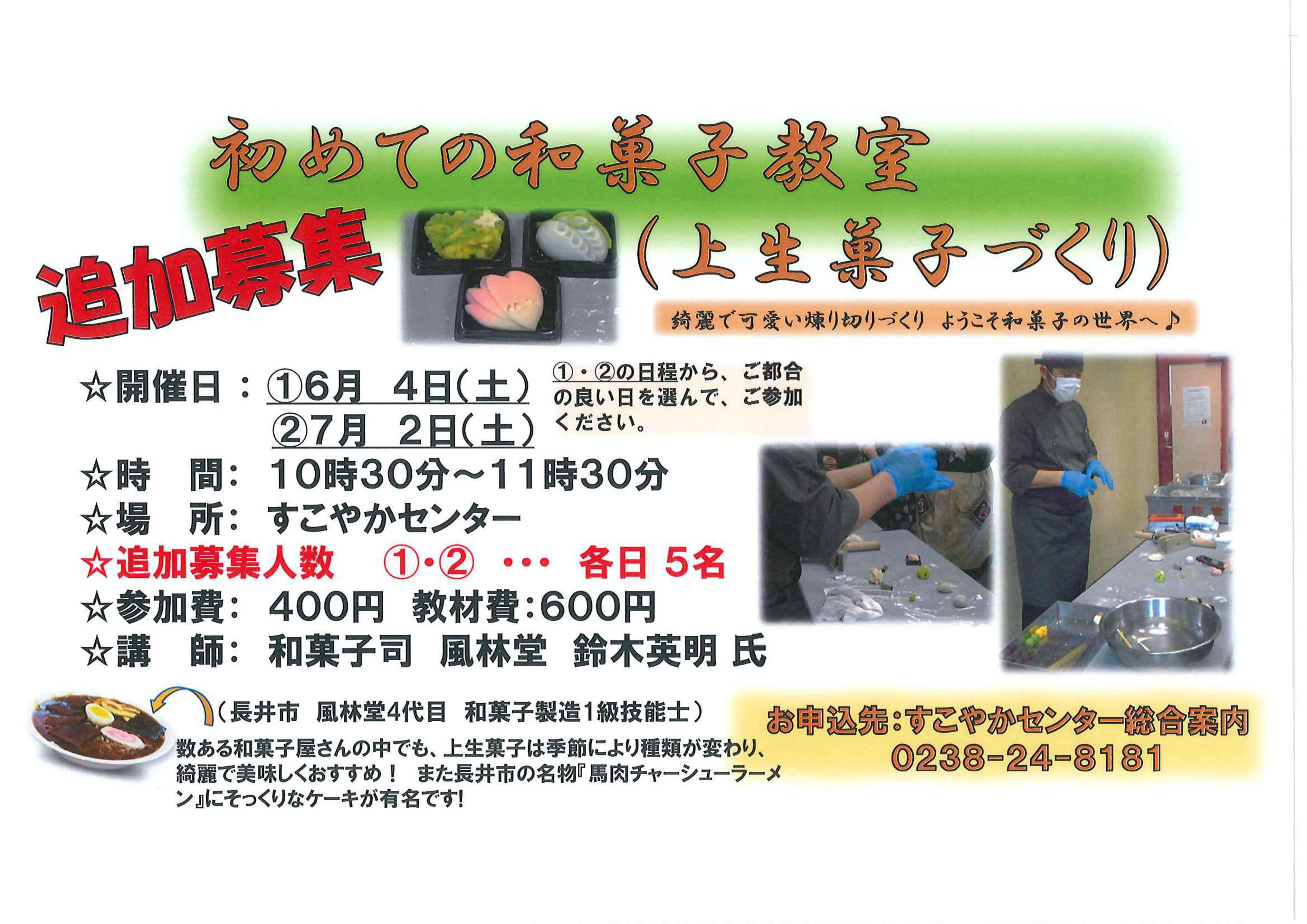 自主事業「初めての和菓子教室」6月・7月講座の追加募集のお知らせです。