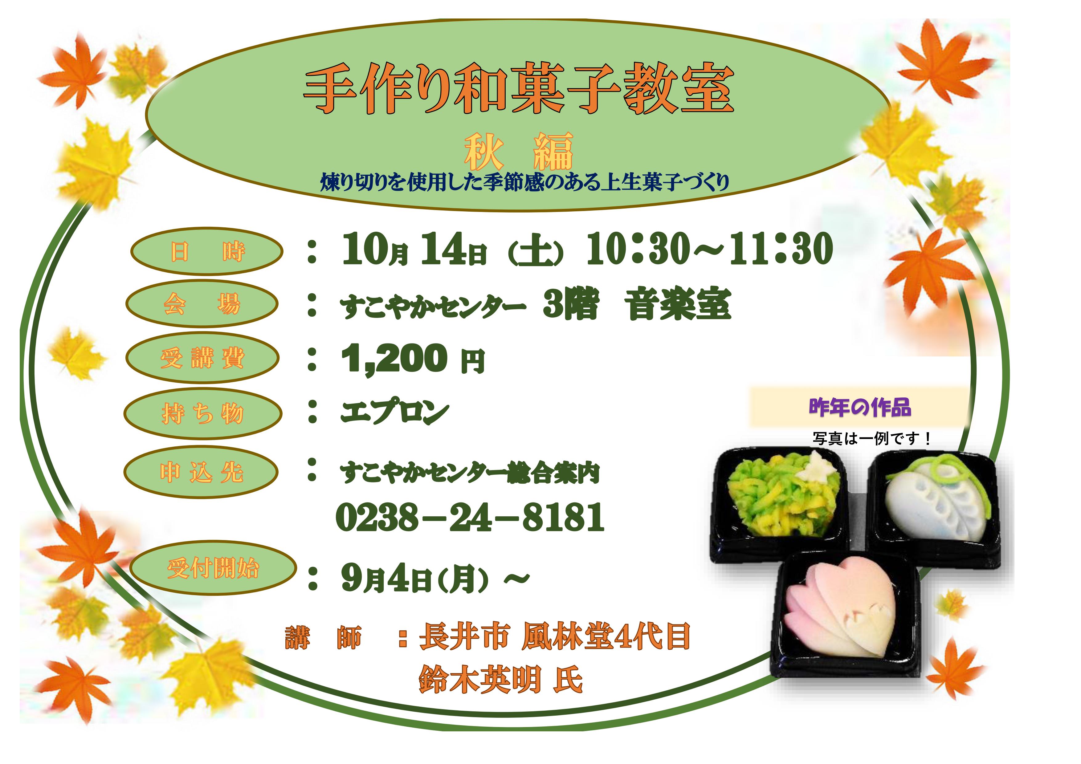 自主事業「手作り和菓子教室 秋編」の受付が、9月4日(月)より開始となります。