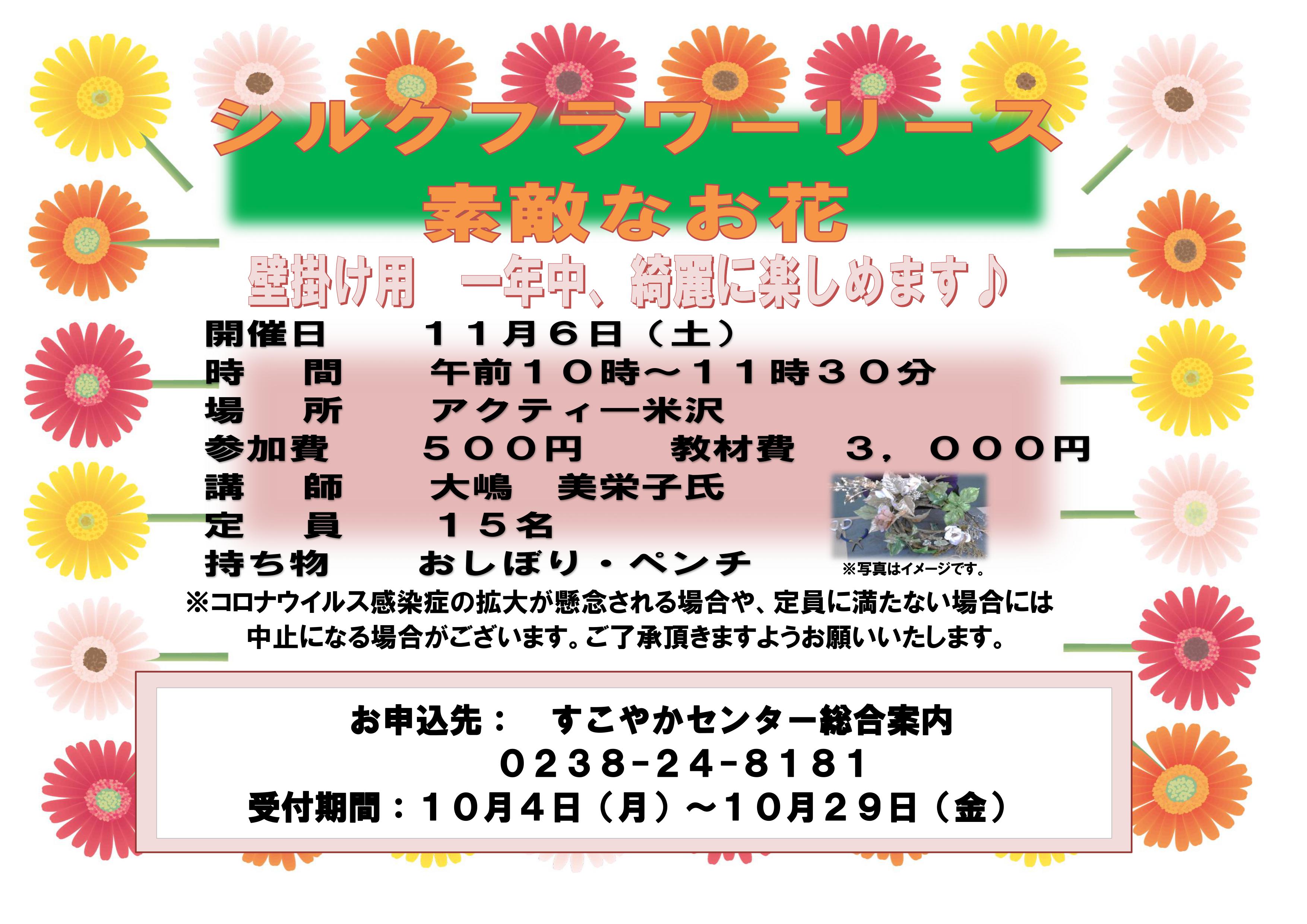 自主事業「シルクフラワーリース素敵なお花」の受付が10月4日(月)より始まります!