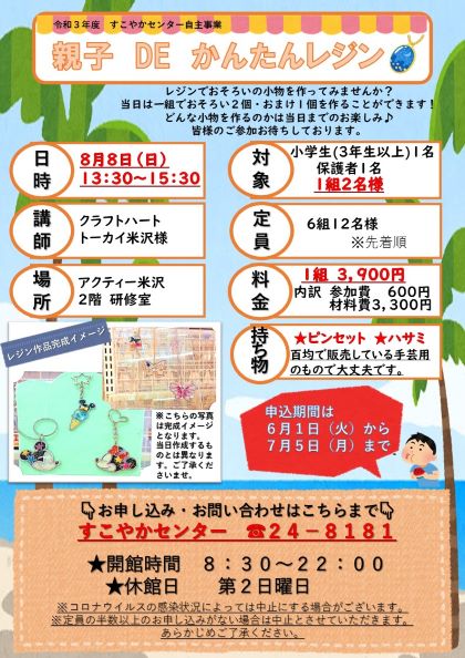 さて、本日6/1(火)より令和3年度すこやかセンター自主事業「親子DEかんたんレジン」の受付が開始いたします!